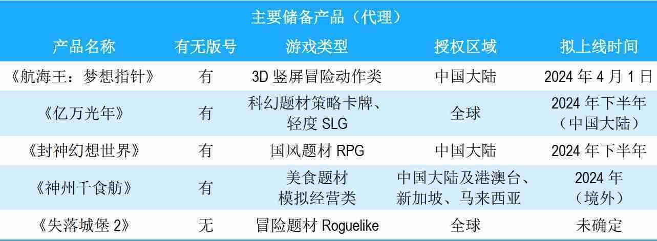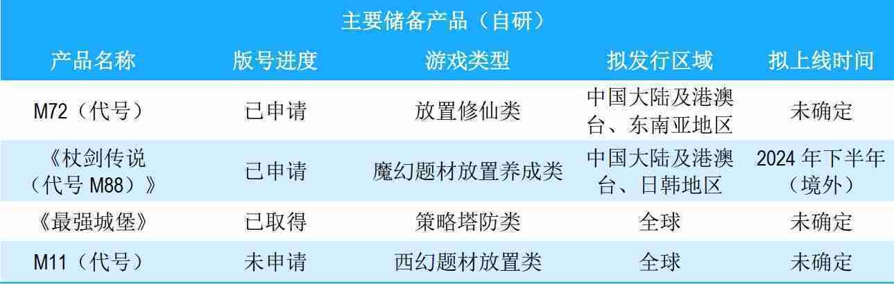 公司储备的多个自研、、、代理产品都在有序推进当中,,,涵盖放置类、、策略类、、模拟经营类、、RPG、、Roguelike等多元化游戏品类,,储备的主要自研和代理产品如下:::
